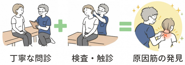 「カウンセリング」「検査」「触診」などを通して正確に割り出し 原因筋そのものから改善を行っていきます。