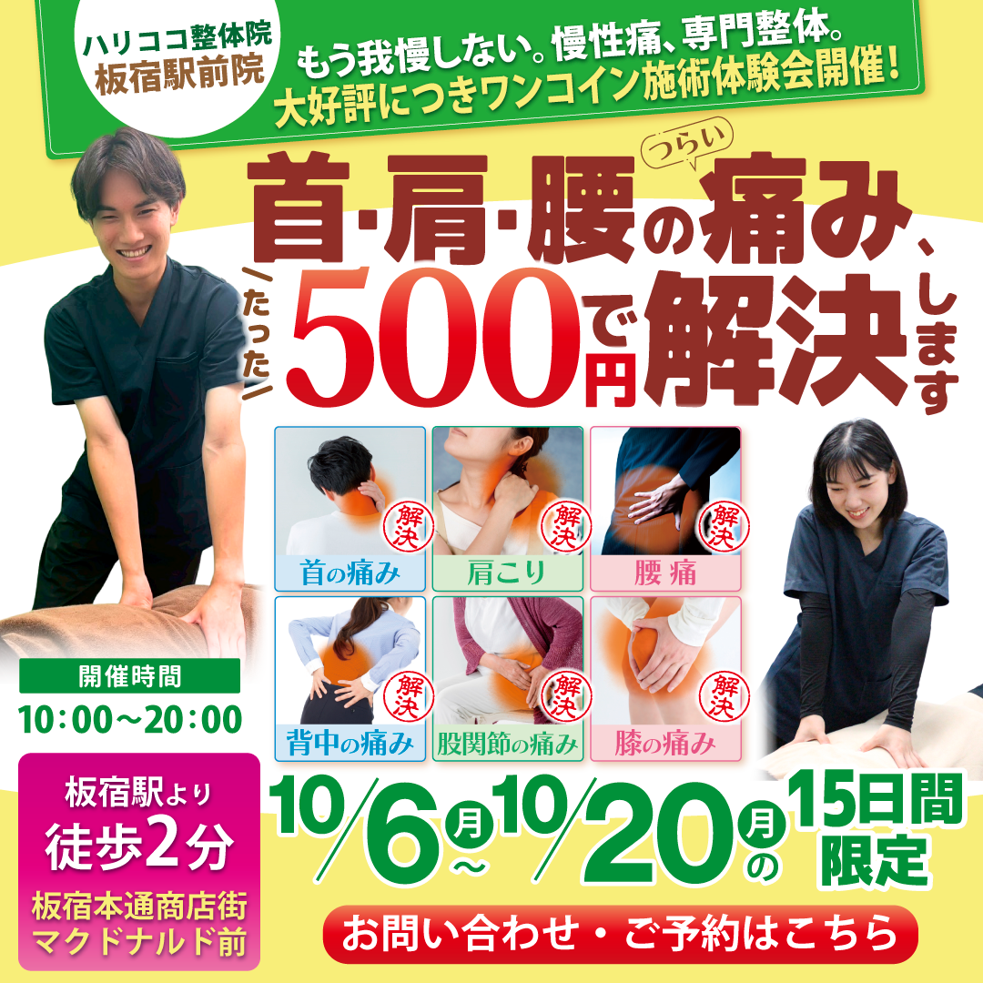 \15日間限定/板宿駅前院ワンコイン施術体験会 \10月6日(月)〜10月20日(月)限定/ 大好評につき15日間限定で ワンコイン施術体験会が復活!! 通常価格8,800円の施術が 500円で受けられる 特別なキャンペーンです! ご予約優先制です。 予約が埋まりやすいので、 事前のご予約がお勧めです✨ ↓電話予約はこちらをタップ↓ ※「体験会の広告を見た」とお伝えください。 ↓LINE予約はこちらをタップ↓ ※メニューの「体験会予約はこちら」をタップして予約に進んでください。
