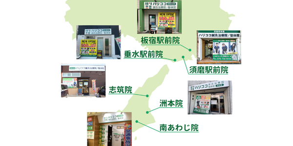 ハリココ整体院グループの代表取締役の「淡路島から肩こり・腰痛を無くしたい!」という想いから、2016年に淡路島で治療院を開院し、おかげさまで淡路島で3店舗、神戸市に2店舗の合計5店舗展開しております。